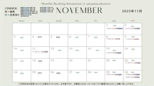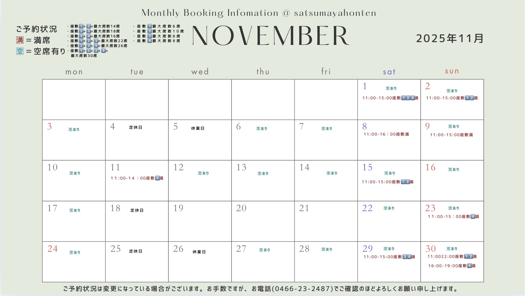 | ご予約状況カレンダー ( カレンダーをクリックすると拡大されます ) ご予約状況は変更になっている場合がございます お手数ですがお電話でご確認のほど お願い申し上げます |