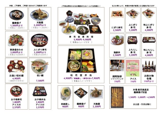 *出前、仕出しは 神奈川県 藤沢市内のみとなります。 *藤沢市外はテイクアウト(お持ち帰り)のご注文のみ承ります。 *配達日時をご予約いただいた場合でも、交通事情等によりご希望に添えない場合も *悪天候などにより配達出来ない場合がございます。 *藤沢市内の配達は、ご注文合計金額5,000円よりご注文承ります。 *藤沢市内の配達は、、使い捨てプラスティック飯台や皿等に盛り付けをしたお品物で、 引き取りが不必要な場合、片道配達料金1,000円加算でのご請求となります。 *藤沢市内の配達は、飯台、お皿、器、お食い初め膳等に盛り付けをしたお品物をご希望で 引き取りが必要な場合は、往復配達料金2,000円加算でのご請求となります。 *テイクアウト(お持ち帰り)の場合はご注文後ご来店頂きまして、お料理、お寿司、 *お食い初め御膳のみのご注文はただいま承っておりません。 *注文ナンバーでの、ご注文をお願い申し上げます 。 *季節、漁、仕入れの状況により、写真と内容が異なる場合がございます。 *わさびの有無、ネタの変更希望などご注文時にお知らせください。 *お支払いは現金でのご精算をお願い申し上げます。 *ご不明な点がございましたら、お気軽にお問い合わせください。 *表示価格には消費税が含まれています。 |