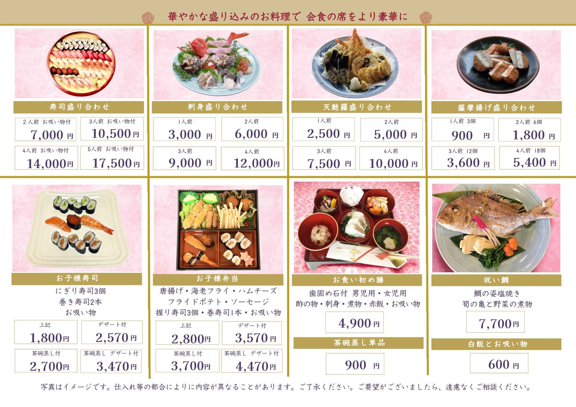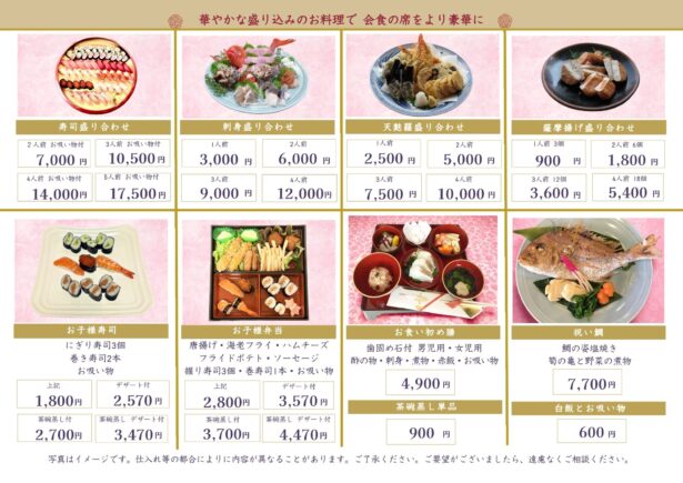 | ◆ 松花堂御膳・茶碗蒸し・寿司・デザート・お椀付◆ お1人様 6,900円(税込)より 写真はイメージです |