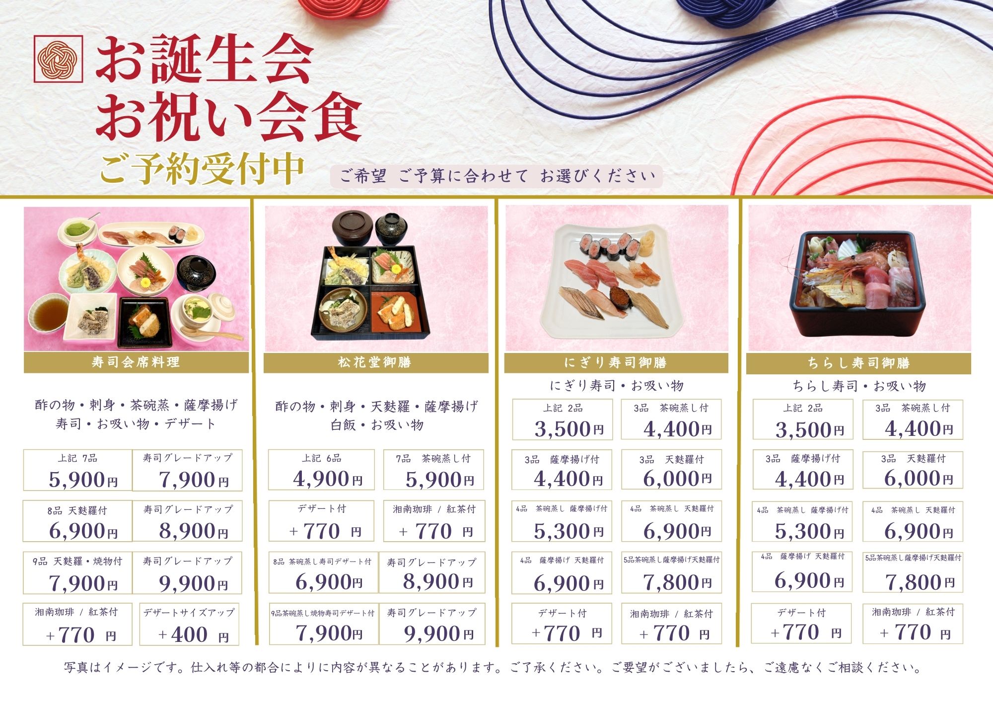 ・お椀 ・にぎり寿司/ ちらし寿司 ・にぎり寿司/ ちらし寿司